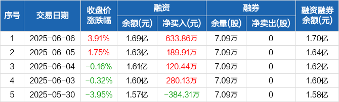 融资方面,当日融资买入3085.24万元,融资偿还2451.38万元,融资净买入633.86万元,连续4日净买入累计1224.33万元。融券方面,融券卖出0股,融券偿还0股,融券余量7.09万股,融券余额47.15万元。融资融券余额合计1.7亿元。