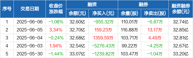 融资方面,当日融资买入1.25亿元,融资偿还1.34亿元,融资净偿还955.32万元。融券方面,融券卖出4.07万股,融券偿还10.94万股,融券余量110.01万股,融券余额1412.59万元。融资融券余额合计32.74亿元。