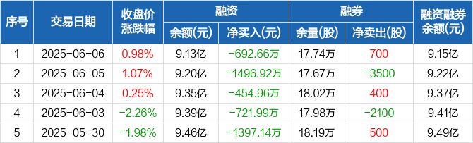 融资方面,当日融资买入3437.9万元,融资偿还4130.56万元,融资净偿还692.66万元,连续6日净偿还累计6115.86万元。融券方面,融券卖出1300股,融券偿还600股,融券余量17.74万股,融券余额219.62万元。融资融券余额合计9.15亿元。