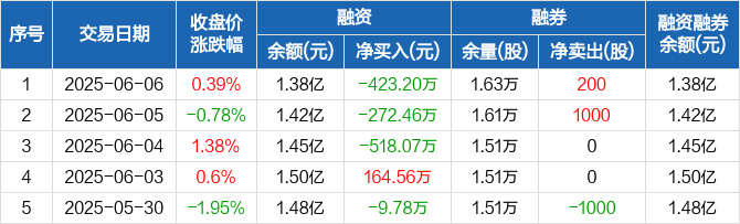 融资方面,当日融资买入656.2万元,融资偿还1079.39万元,融资净偿还423.2万元,连续3日净偿还累计1213.72万元。融券方面,融券卖出200股,融券偿还0股,融券余量1.63万股,融券余额8.33万元。融资融券余额合计1.38亿元。