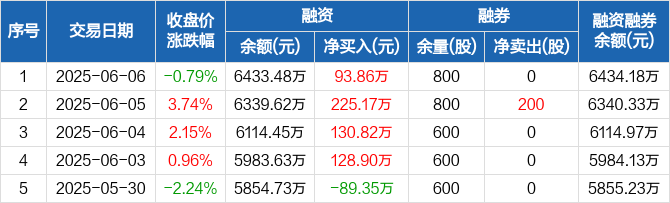 融资方面,当日融资买入632.58万元,融资偿还538.72万元,融资净买入93.86万元,连续4日净买入累计578.74万元。融券方面,融券卖出0股,融券偿还0股,融券余量800股,融券余额7048元。融资融券余额合计6434.18万元。