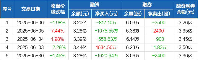 融资方面,当日融资买入2097.15万元,融资偿还2914.25万元,融资净偿还817.1万元,连续3日净偿还累计2451.28万元。融券方面,融券卖出2800股,融券偿还6300股,融券余量6.03万股,融券余额635.37万元。融资融券余额合计3.26亿元。