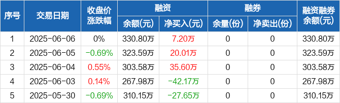 融资方面,当日融资买入33.63万元,融资偿还26.42万元,融资净买入7.2万元,连续3日净买入累计62.82万元。融券方面,融券卖出0份,融券偿还0份,融券余量0份,融券余额0元。融资融券余额合计330.8万元。