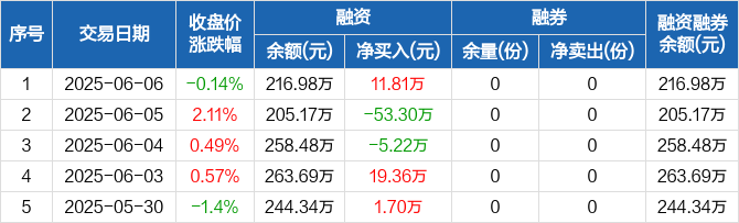 融资方面,当日融资买入18.25万元,融资偿还6.44万元,融资净买入11.81万元。融券方面,融券卖出0份,融券偿还0份,融券余量0份,融券余额0元。融资融券余额合计216.98万元。