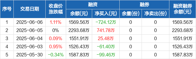 融资方面,当日融资买入199.52万元,融资偿还923.65万元,融资净偿还724.12万元。融券方面,融券卖出0份,融券偿还0份,融券余量0份,融券余额0元。融资融券余额合计1569.56万元。