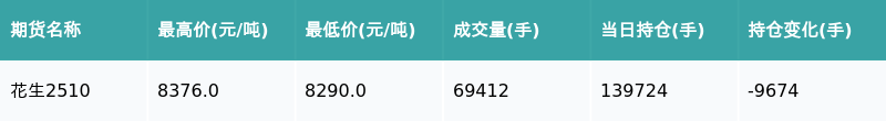 南财智讯6月9日电,南财金融终端盘后期货数据显示,郑州商品交易所的花生主力合约收跌1.17%,收盘报8310.0元/吨,日内资金流出7315.71万元。其他相关指标见下表: