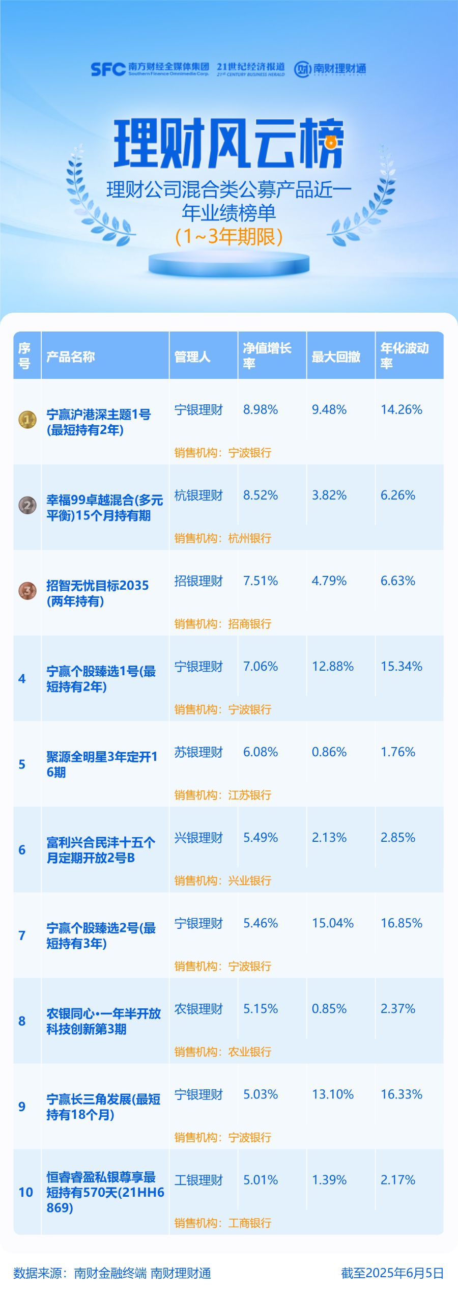 “固收+权益”产品统计范围为理财公司投资周期在3年以上的“固收+权益”公募产品,且近1年每个完整的自然季均为正收益;混合类产品统计范围为理财公司投资周期在1~3年(含)的混合类公募产品;权益类产品统计范围为理财公司发行的权益类公募产品。“固收+权益”和混合类产品统计区间为近一年。权益类产品统计区间为近六月。