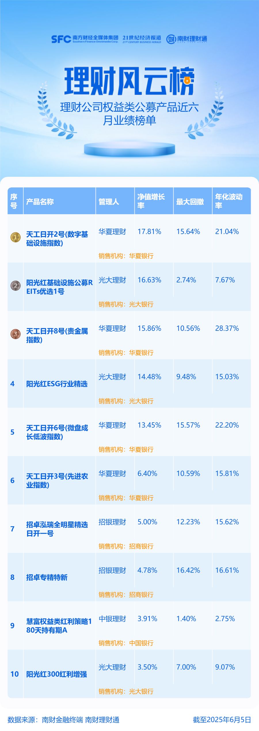理财公司权益类理财近六月净值增长率均值和最大回撤分别为2.75%和11.19%。仅从收益看,华夏理财“天工日开2号(数字基础设施指数)”、光大理财“阳光红基础设施公募REITs优选1号”和华夏理财“天工日开8号(贵金属指数)”表现较好,近六月净值增长率分别为17.81%、16.63%和15.86%。