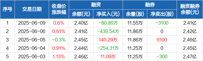 融资方面,当日融资买入461.78万元,融资偿还542.67万元,融资净偿还80.89万元。融券方面,融券卖出0股,融券偿还3100股,融券余量11.55万股,融券余额115.73万元。融资融券余额合计2.41亿元。