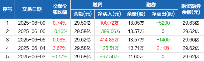 融资方面,当日融资买入4411.16万元,融资偿还4310.43万元,融资净买入100.72万元。融券方面,融券卖出9300股,融券偿还1.45万股,融券余量13.05万股,融券余额409.97万元。融资融券余额合计29.63亿元。