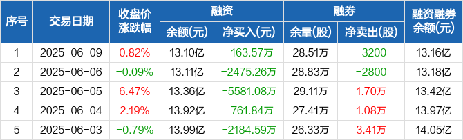 蓝思科技融资融券信息显示,2025年6月9日融资净偿还163.57万元;融资余额13.1亿元,较前一日下降0.12%。