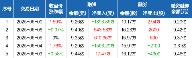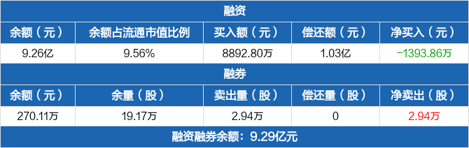 融资方面,当日融资买入8892.8万元,融资偿还1.03亿元,融资净偿还1393.86万元。融券方面,融券卖出2.94万股,融券偿还0股,融券余量19.17万股,融券余额270.11万元。融资融券余额合计9.29亿元。