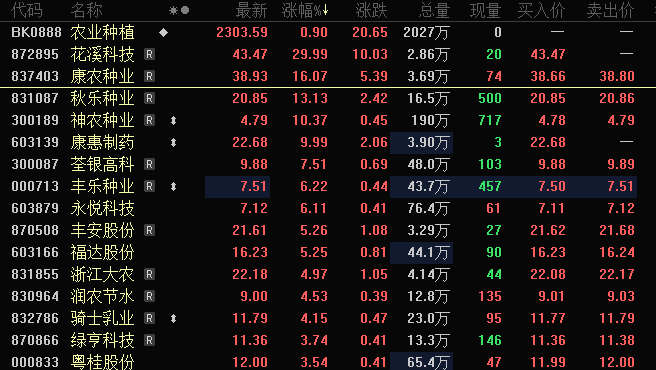 种业板块逆势拉升,花溪科技“30cm”涨停,康农种业、秋乐种业、神农种业涨超10%,荃银高科、丰乐种业、新赛股份等快速冲高。
