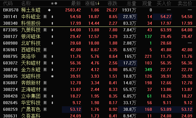 午后约13:20,稀土永磁板块突然大幅拉升,中科磁业由涨幅不到6%,拉升至一度“20cm”涨停板;银河磁体由涨幅不到2%,一度拉升至18%以上;九菱科技由涨幅不到1%,一度拉升至22%以上。西磁科技、金力永磁、英洛华、正海磁材、广晟有色等多只概念股跟随大涨。