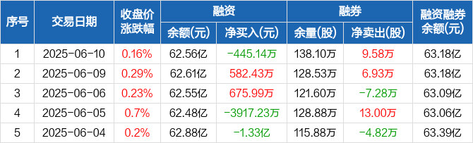 招商银行融资融券信息显示,2025年6月10日融资净偿还445.14万元;融资余额62.56亿元,较前一日下降0.07%。