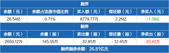 融资方面,当日融资买入8779.77万元,融资偿还2.26亿元,融资净偿还1.38亿元,净偿还额两市排名第二。融券方面,融券卖出32.85万股,融券偿还12.45万股,融券余量145.55万股,融券余额2659.12万元。融资融券余额合计26.81亿元。
