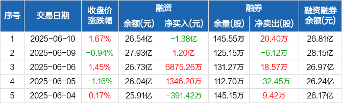 紫金矿业融资融券信息显示,2025年6月10日融资净偿还1.38亿元;融资余额26.54亿元,较前一日下降4.95%。