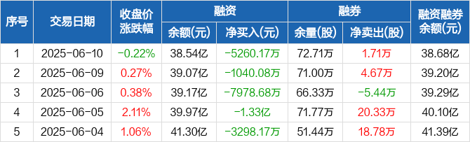 国泰海通融资融券信息显示,2025年6月10日融资净偿还5260.17万元;融资余额38.54亿元,较前一日下降1.35%。