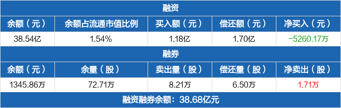 融资方面,当日融资买入1.18亿元,融资偿还1.7亿元,融资净偿还5260.17万元,连续8日净偿还累计3.91亿元。融券方面,融券卖出8.21万股,融券偿还6.5万股,融券余量72.71万股,融券余额1345.86万元。融资融券余额合计38.68亿元。