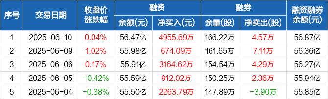 兴业银行融资融券信息显示,2025年6月10日融资净买入4955.69万元;融资余额56.47亿元,较前一日增加0.89%。