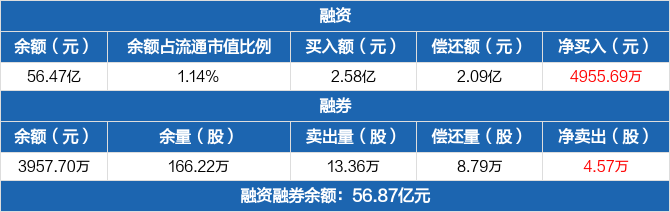融资方面,当日融资买入2.58亿元,融资偿还2.09亿元,融资净买入4955.69万元,连续5日净买入累计1.2亿元。融券方面,融券卖出13.36万股,融券偿还8.79万股,融券余量166.22万股,融券余额3957.7万元。融资融券余额合计56.87亿元。
