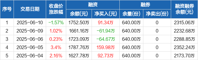 融资方面,当日融资买入259.55万元,融资偿还168.21万元,融资净买入91.34万元。融券方面,融券卖出0份,融券偿还0份,融券余量640万份,融券余额562.56万元。融资融券余额合计2315.06万元。