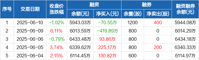 融资方面,当日融资买入361.49万元,融资偿还432.04万元,融资净偿还70.55万元。融券方面,融券卖出500股,融券偿还100股,融券余量1200股,融券余额1.05万元。融资融券余额合计5944.08万元。