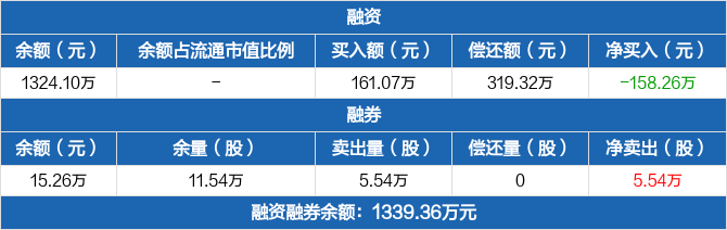 融资方面,当日融资买入161.07万元,融资偿还319.32万元,融资净偿还158.26万元。融券方面,融券卖出5.54万份,融券偿还0份,融券余量11.54万份,融券余额15.26万元。融资融券余额合计1339.36万元。