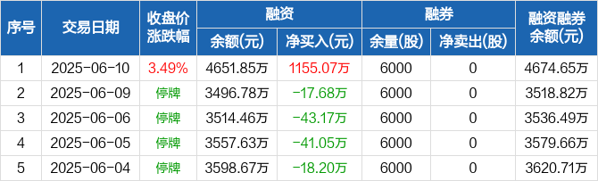 融资方面,当日融资买入2443.65万元,融资偿还1288.58万元,融资净买入1155.07万元。融券方面,融券卖出0股,融券偿还0股,融券余量6000股,融券余额22.8万元。融资融券余额合计4674.65万元。