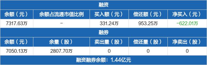 融资方面,当日融资买入331.24万元,融资偿还953.25万元,融资净偿还622.01万元。融券方面,融券卖出0份,融券偿还0份,融券余量2807.7万份,融券余额7050.13万元。融资融券余额合计1.44亿元。