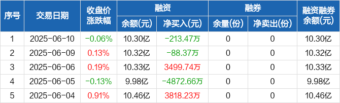 融资方面,当日融资买入4.29亿元,融资偿还4.31亿元,融资净偿还213.47万元。融券方面,融券卖出0份,融券偿还0份,融券余量0份,融券余额0元。融资融券余额合计10.3亿元。
