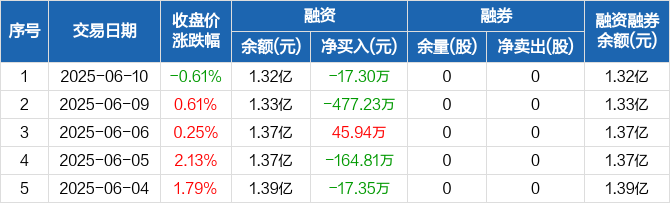 融资方面,当日融资买入414.72万元,融资偿还432.02万元,融资净偿还17.3万元。融券方面,融券卖出0股,融券偿还0股,融券余量0股,融券余额0元。融资融券余额合计1.32亿元。