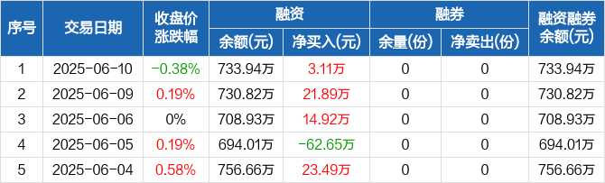 融资方面,当日融资买入176.32万元,融资偿还173.21万元,融资净买入3.11万元,连续3日净买入累计39.93万元。融券方面,融券卖出0份,融券偿还0份,融券余量0份,融券余额0元。融资融券余额合计733.94万元。