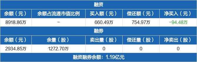 融资方面,当日融资买入660.49万元,融资偿还754.97万元,融资净偿还94.48万元。融券方面,融券卖出0份,融券偿还0份,融券余量1272.7万份,融券余额2934.85万元。融资融券余额合计1.19亿元。