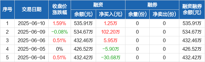 融资方面,当日融资买入158.53万元,融资偿还157.28万元,融资净买入1.25万元,连续3日净买入累计109.4万元。融券方面,融券卖出0份,融券偿还0份,融券余量0份,融券余额0元。融资融券余额合计535.91万元。