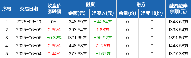 融资方面,当日融资买入22.77万元,融资偿还67.61万元,融资净偿还44.84万元。融券方面,融券卖出0份,融券偿还0份,融券余量0份,融券余额0元。融资融券余额合计1348.69万元。