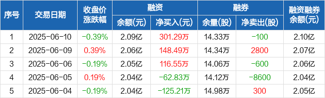 融资方面,当日融资买入2018.78万元,融资偿还1717.49万元,融资净买入301.29万元,连续3日净买入累计566.33万元。融券方面,融券卖出2.16万股,融券偿还2.17万股,融券余量14.33万股,融券余额74.09万元。融资融券余额合计2.1亿元。