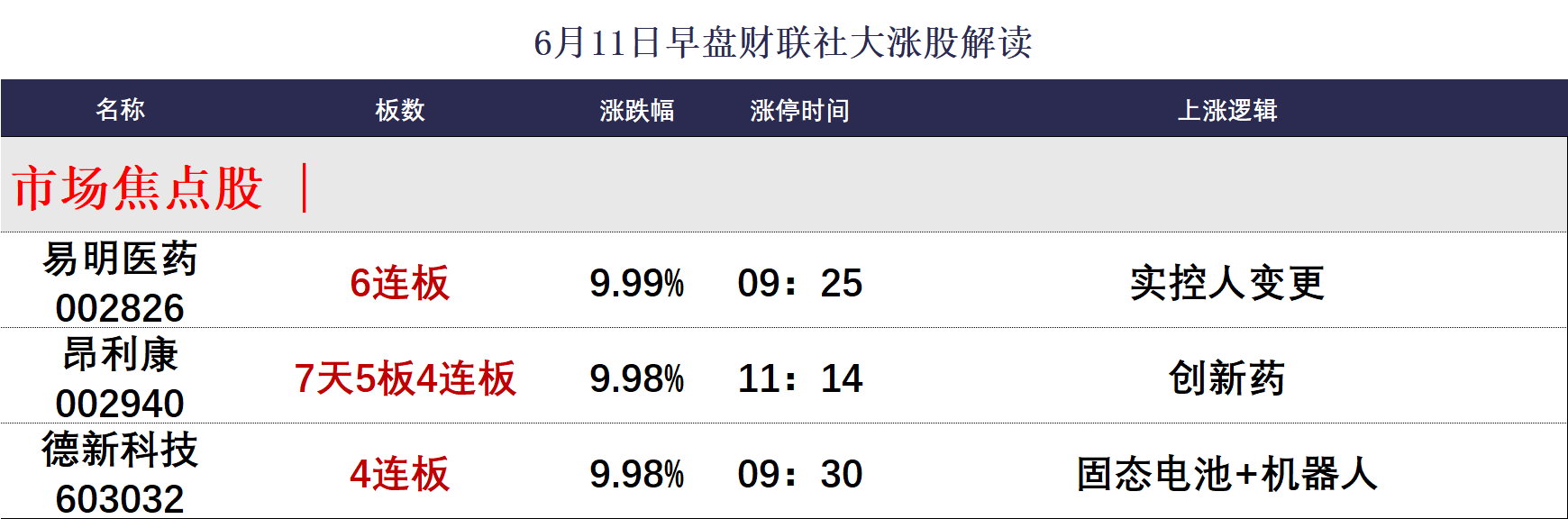 今日午盘全市场共41股涨停,连板股总数10只,18股封板未遂,封板率为69%(不含ST股、退市股)。焦点股方面,易明医药一字涨停晋级6连板,创新药概念股昂利康走出7天5板,固态电池概念股德新科技4连板。
