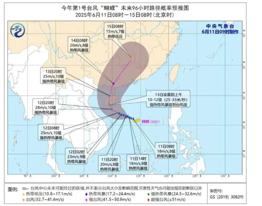 今年第1号台风“蝴蝶”(热带风暴级)已于6月11日8点钟在南海中西部海面生成,其中心位于海南省三沙市(西沙永兴岛)东南方向约165公里的海面上(北纬16.1度、东经113.7度),8级(18米/秒),995百帕,7级风圈半径为100-260公里。