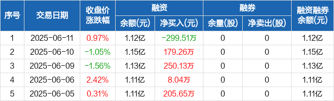 融资方面,当日融资买入235.76万元,融资偿还535.27万元,融资净偿还299.51万元。融券方面,融券卖出0股,融券偿还0股,融券余量0股,融券余额0元。融资融券余额合计1.12亿元。