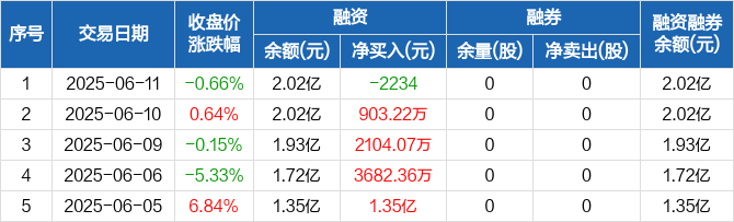 融资方面,当日融资买入3383.22万元,融资偿还3383.45万元,融资净偿还2234元。融券方面,融券卖出0股,融券偿还0股,融券余量0股,融券余额0元。融资融券余额合计2.02亿元。
