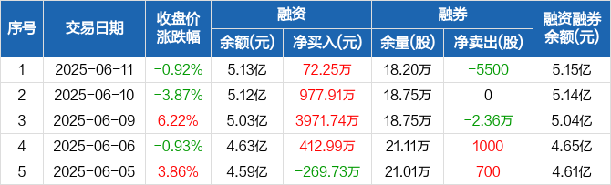 融资方面,当日融资买入4636.01万元,融资偿还4563.76万元,融资净买入72.25万元,连续4日净买入累计5434.89万元。融券方面,融券卖出0股,融券偿还5500股,融券余量18.2万股,融券余额156.88万元。融资融券余额合计5.15亿元。