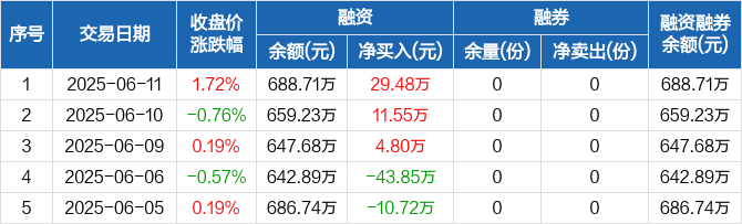 融资方面,当日融资买入157.32万元,融资偿还127.84万元,融资净买入29.48万元,连续3日净买入累计45.83万元。融券方面,融券卖出0份,融券偿还0份,融券余量0份,融券余额0元。融资融券余额合计688.71万元。