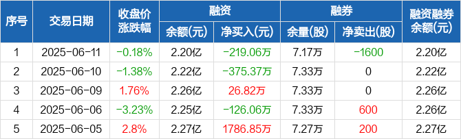 融资方面,当日融资买入1212.61万元,融资偿还1431.67万元,融资净偿还219.06万元。融券方面,融券卖出0股,融券偿还1600股,融券余量7.17万股,融券余额40.87万元。融资融券余额合计2.2亿元。