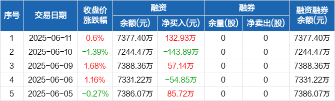 融资方面,当日融资买入284.76万元,融资偿还151.83万元,融资净买入132.93万元。融券方面,融券卖出0股,融券偿还0股,融券余量0股,融券余额0元。融资融券余额合计7377.4万元。