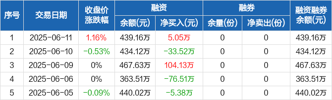 融资方面,当日融资买入87.15万元,融资偿还82.1万元,融资净买入5.05万元。融券方面,融券卖出0份,融券偿还0份,融券余量0份,融券余额0元。融资融券余额合计439.16万元。