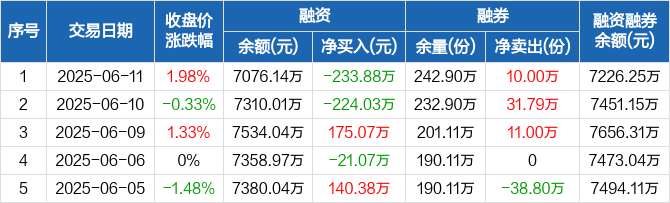 融资方面,当日融资买入752.32万元,融资偿还986.2万元,融资净偿还233.88万元。融券方面,融券卖出10万份,融券偿还0份,融券余量242.9万份,融券余额150.11万元。融资融券余额合计7226.25万元。