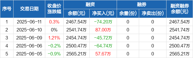 融资方面,当日融资买入124.94万元,融资偿还199.14万元,融资净偿还74.2万元。融券方面,融券卖出0份,融券偿还0份,融券余量0份,融券余额0元。融资融券余额合计2467.54万元。