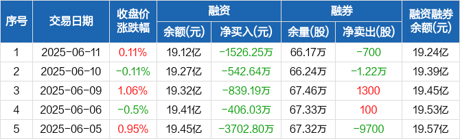融资方面,当日融资买入7978.26万元,融资偿还9504.51万元,融资净偿还1526.25万元,连续7日净偿还累计1.44亿元。融券方面,融券卖出1.95万股,融券偿还2.02万股,融券余量66.17万股,融券余额1198.34万元。融资融券余额合计19.24亿元。