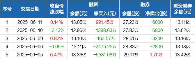 融资方面,当日融资买入7265.15万元,融资偿还6343.7万元,融资净买入921.45万元。融券方面,融券卖出3700股,融券偿还9700股,融券余量27.23万股,融券余额588.17万元。融资融券余额合计13.11亿元。